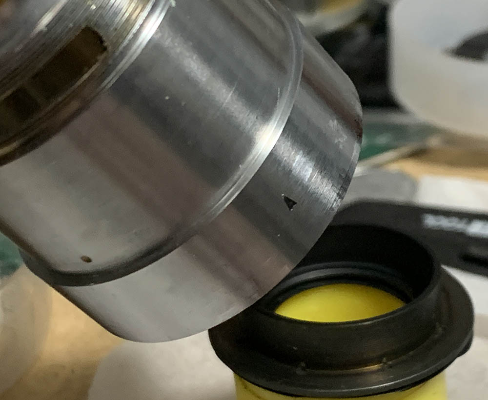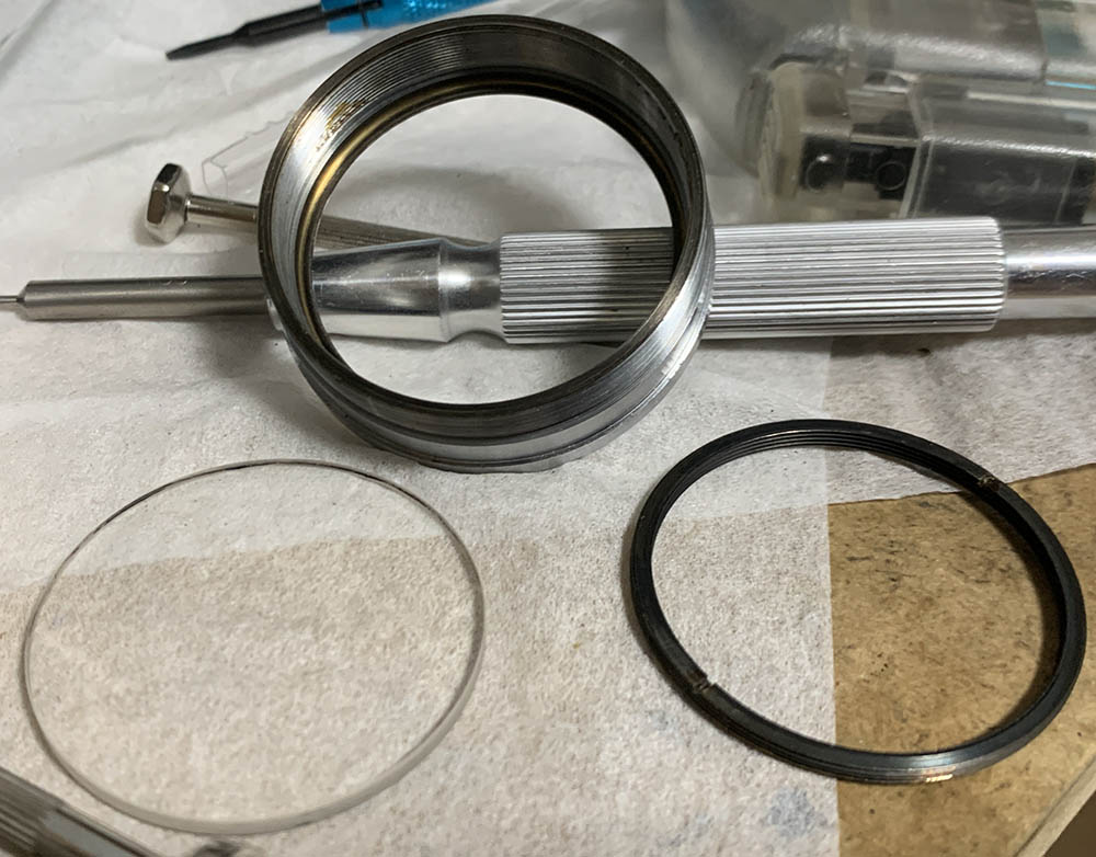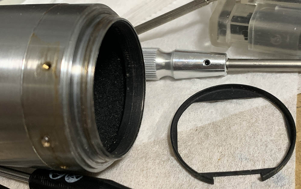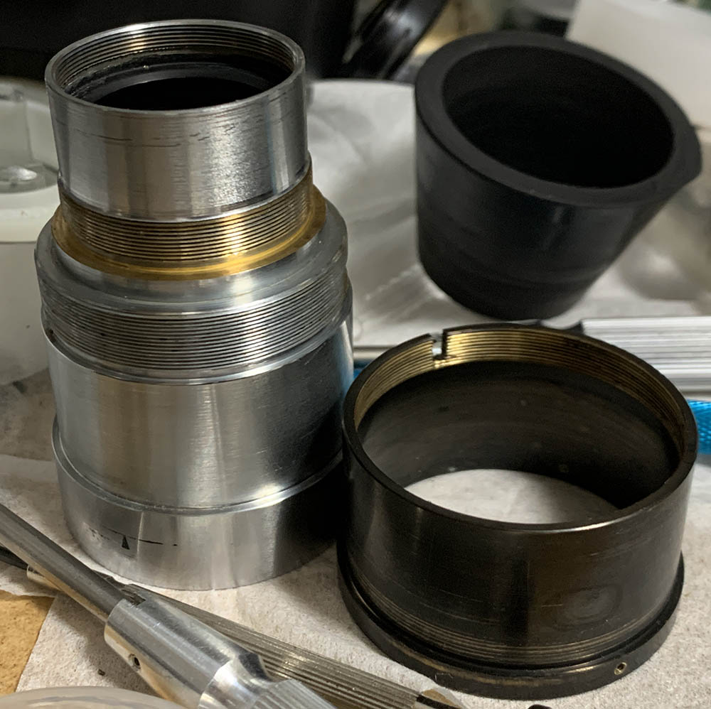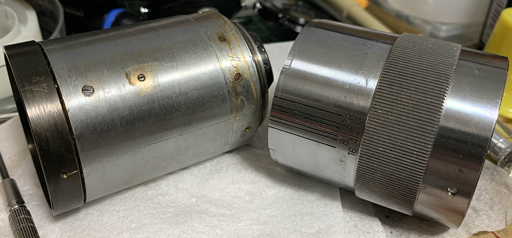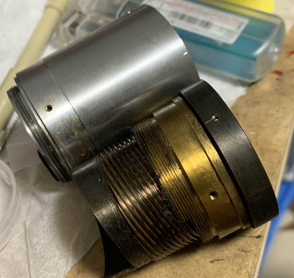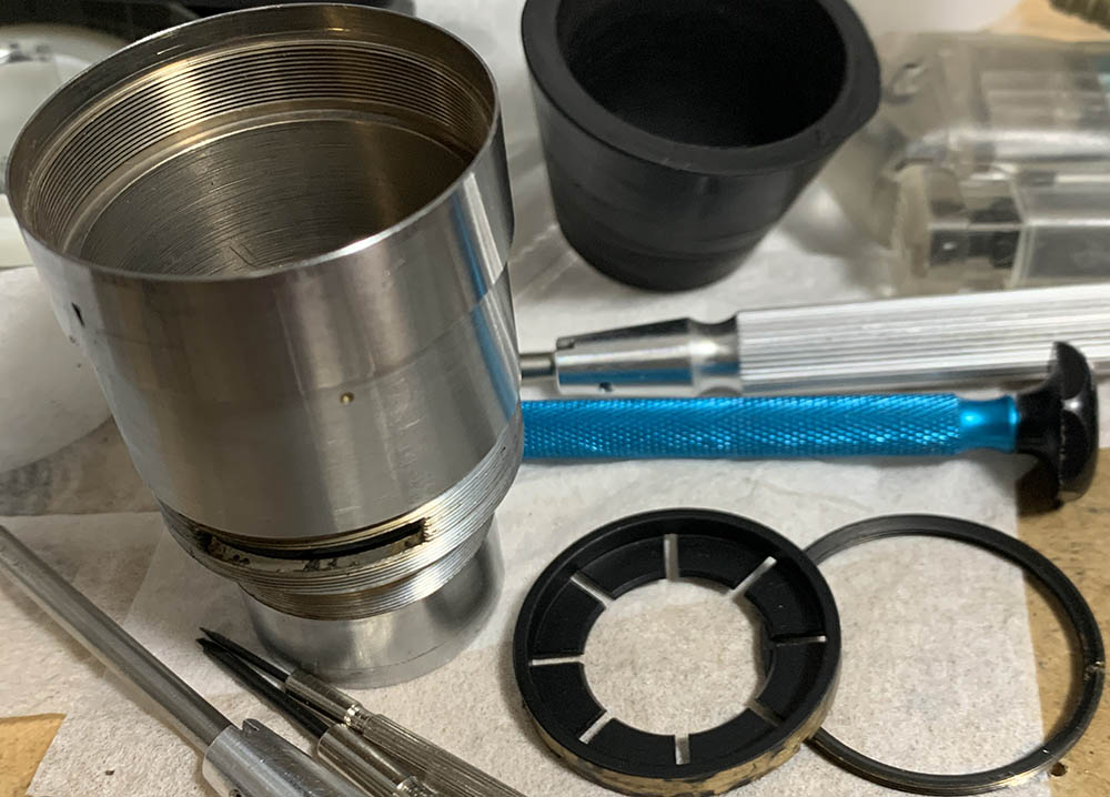 Set everything aside and clean everything very well. I scrubbed the helicoids and all metal parts except for the screws and small parts, I used a stiff brush and some strong toilet detergent to make sure that all the decades-old lubricant, germs and other nasty stuff are gone. Rinse everything with hot water then finally do a final rinse with alcohol to remove any residue. The helicoids will benefit from an overnight pickling in an alcohol bath, that should soften up the felt lining so you can remove it easier later and replace it with a fresh sheet that’s suitable. In some lenses you may even find a cord or similar material wrapped around a slot in the helicoids, this material is used to soak-up excess oil and keep the helicoids from drying up. It’s disgusting leaving that filthy thing around, I don’t care if it’s an original part, but it has to go.