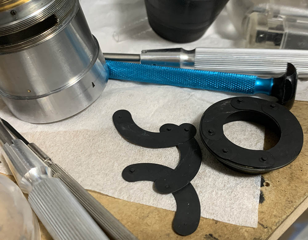 You can now access the iris blades, carefully inspect the blades before you remove anything. You can get them all off safely by tapping at the other end with your palm and let the blades drop into a soft towel. It will cushion the fall and keep the blades safe.
