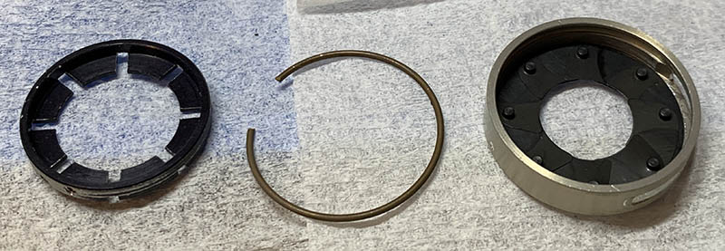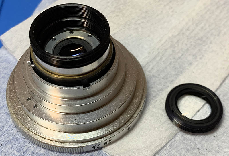 Use a needle to pry this circlip off while being careful not to damage the iris. It keeps everything together so you can safely remove the diaphragm plate once it’s gone.