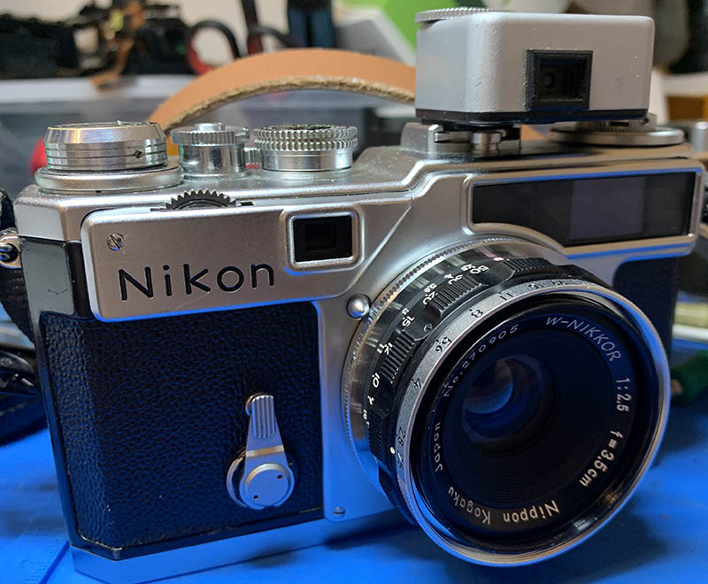 It is perfect when paired with a Nikon SP because it has a built-in viewfinder for 35mm. That viewfinder is tiny but at least you don’t need to attach a separate one so the accessory shoe can accommodate a light meter such as this Voigtländer VC Meter.