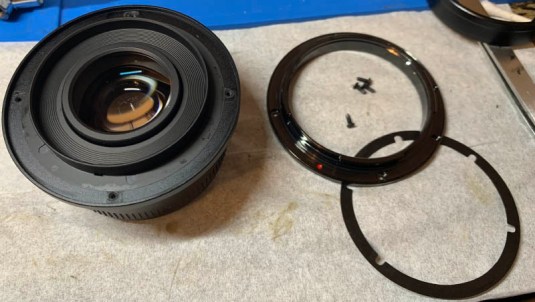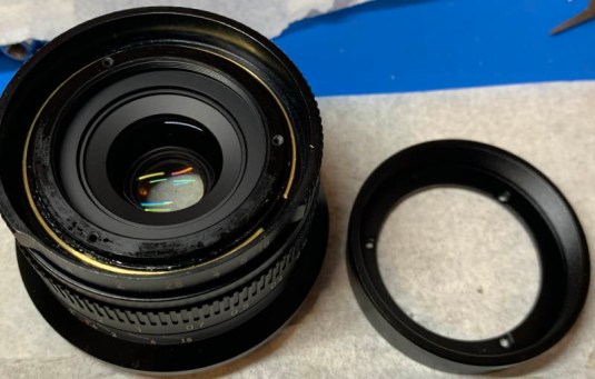 There are shims underneath the bayonet mount, don’t lose any of them since this is the only way the lens can be adjusted to focus properly. What is also worth noting is the bayonet mount won’t sit flat perfectly if you’ve tightened any of the screws at one side, you should tighten them all at the same rate. This sucks, I’m not sure what causes this but it may be due to imprecise machining or a mistake in the beveling.