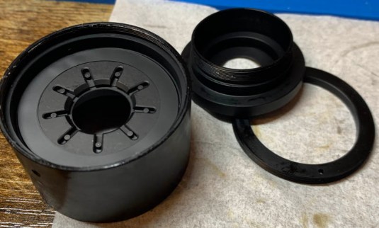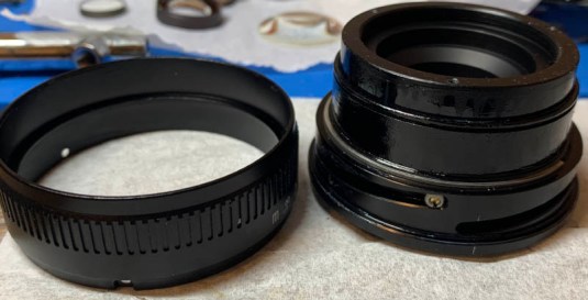 This is how clean the internal barrels look like after cleaning them. Just follow my tips on how to lubricate this in the previous section and you should be fine. One more thing that you could do is to use a very fine grit sandpaper to even out the finish of the paint for the inner barrel and the surfaces that it comes in the contact with. You then polish them even more with an even finer grit sandpaper for a super smooth finish. This will allow you to use even less grease in order to make the focusing ring feel super smooth. I usually see these parts in bare metal or in smooth finishes but we have an undulating surface on this one. This is what we call “orange peel” effect in airbrushing. If I could go back in time I wish I did it because I am way too far into the process and I don’t want to dismantle everything again just for that!