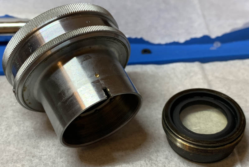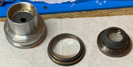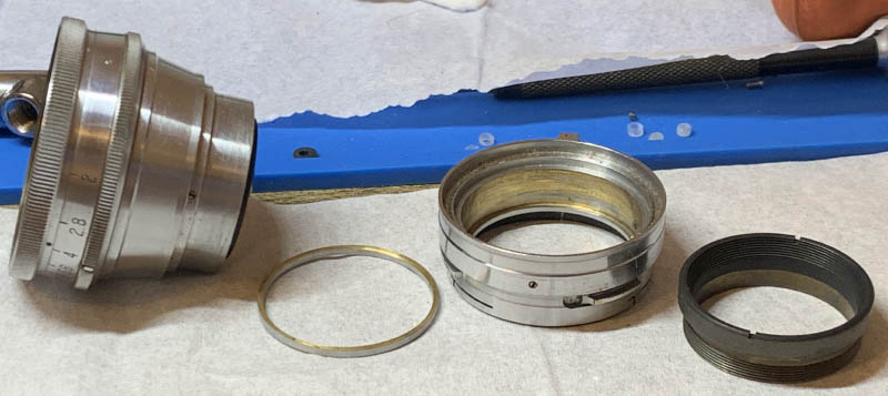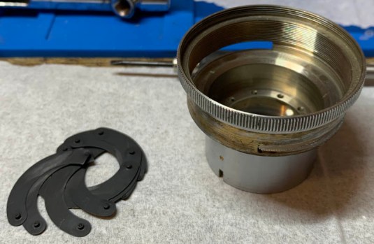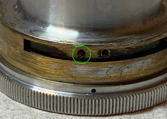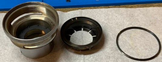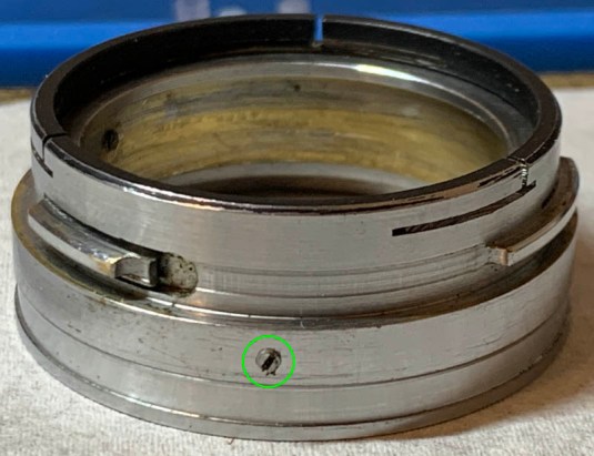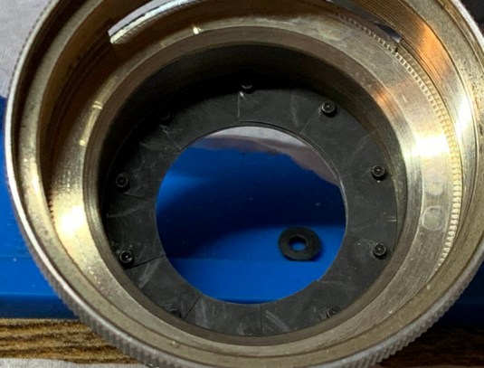 Carefully extract the screws securing the aperture ring. They are special screws so don’t lose them. They couple the aperture ring to the iris mechanism inside of the objective’s housing.