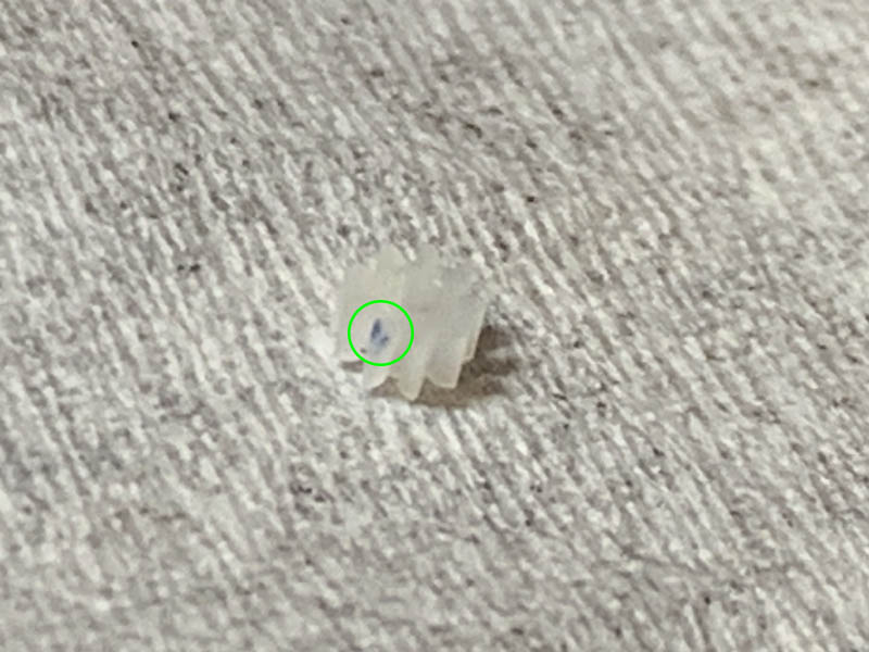 The gear is very small, it’s probably less than 2mm across! You can see a blue mark where the damage is. I don’t know why it’s blue but I suspect it’s just lubricant that got trapped in the chipped tooth of the gear. Pull it off carefully and replace it with a new part. If you don’t have any replacement parts you can just get a fine file and sand it smooth then mount the gear in reverse. I’m not sure if that will work or how long it’s going to last but at least I gave you an idea.
