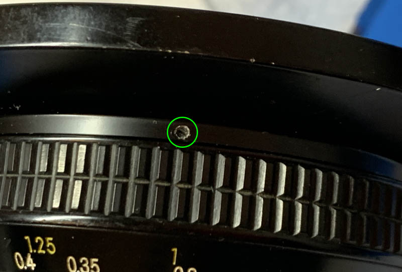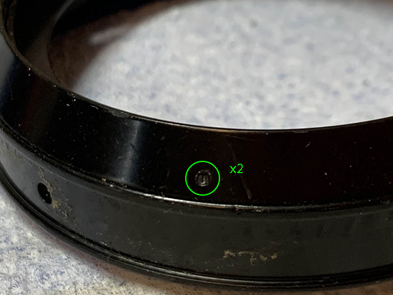 Locate and carefully extract these to remove the distance scale. It’s not required but it will allow you to clean the lens thoroughly because germs can hide here. These 2 screws are tiny and may also be sealed so a drop of acetone should help soften it up.