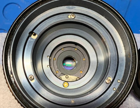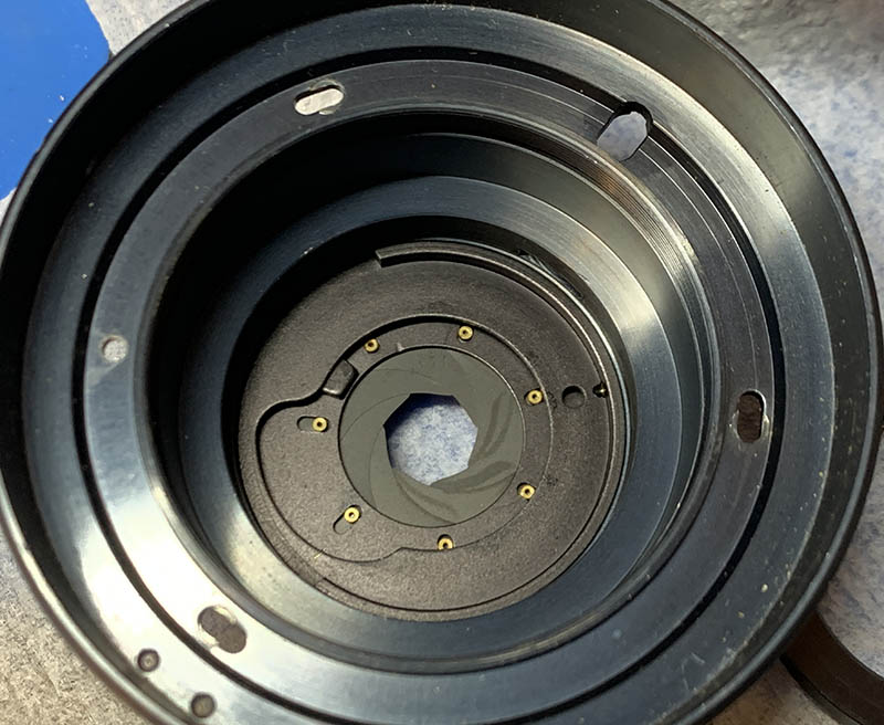 This is how the aperture blades are arranged. You must be very careful when removing them because they are delicate. I push them from behind through the pins as it’s the most rigid part of each blade.