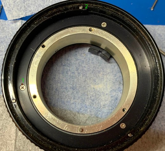 The screws marked as #1 secure the focusing ring, while the ones marked as #2 secure the focus adjuster. For now, just remove all the #1 screws to remove the focusing ring.