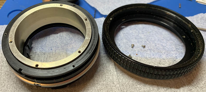 Carefully remove these screws, the tall one couples the aperture ring to the iris mechanism. The screws on the silver part secures the grip and depth-of-field scale to the inner barrel, there’s 3 of them.