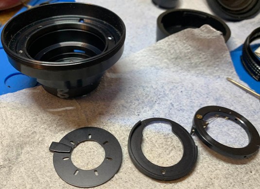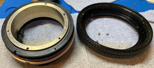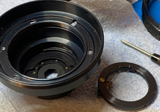 Carefully extract the screws from the lens mount, read my article on how to remove bayonet screws so you won’t strip them. Do not ignore this warning. Remove the bayonet mount and you should not dismantle it any further unless it’s broken or dirty because it has bearing balls that can be difficult to put back. Ignore the fact that the housing is still in the barrel in this photo, this is the correct sequence.
