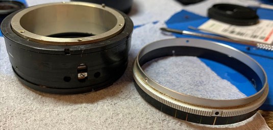 Let’s go back to the front, you can actually do this right after removing the housing. I made a small mark so I will know how the focusing ring is aligned to the helicoid underneath it.