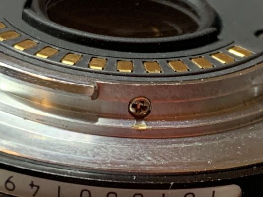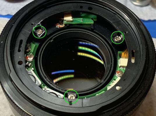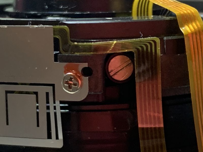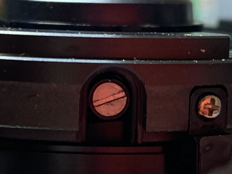 This is the adjustable element that I was referring to. You loosen these screws then nudge it until you are able to get a sharp image, or at least something with not a lot of astigmatism. You will need a special tool for it and the only way I was able to do it is with a magnifying glass and pray for good luck. Since the lens has been worked on by another person before, I doubt that this is in its correct position from the factory.