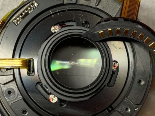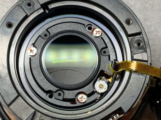 Once the screw is gone you will be able to remove the peanut motor. Be very careful when handling it as it is left attached to the lens, that’s why everything is dangling in a precarious state.