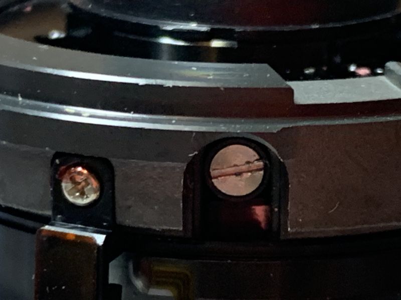 This is the adjustable element that I was referring to. You loosen these screws then nudge it until you are able to get a sharp image, or at least something with not a lot of astigmatism. You will need a special tool for it and the only way I was able to do it is with a magnifying glass and pray for good luck. Since the lens has been worked on by another person before, I doubt that this is in its correct position from the factory.
