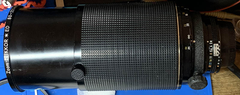 The Nikon F3 is dwarfed by this humongous lens. The ergonomics of the setup is perfect, the compliment each other but I would imagine that a Nikon F4 will be better because of its size and weight. You will not need special focusing screens when shooting in lowlight because its maximum aperture is bright enough. The slower Zoom-Nikkor 80-200mm f4 Ai-S will require special screens for this purpose, one that does not have a split-prism at the center.