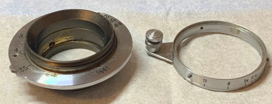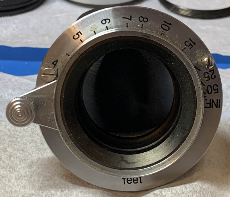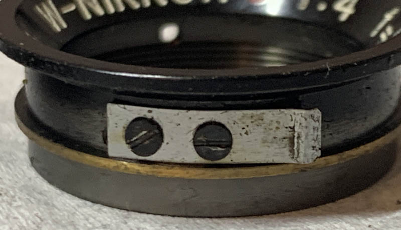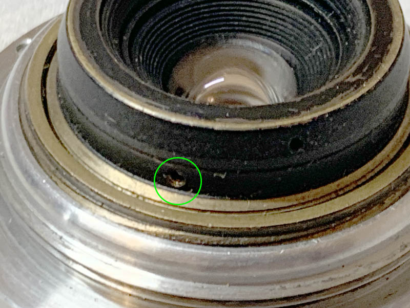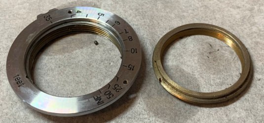 After marking the original position of the focusing ring at infinity, loosen its screws so you can lift it off. Do not disturb the alignment of the helicoid so you will know its exact position at infinity.
