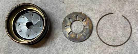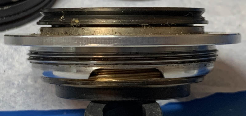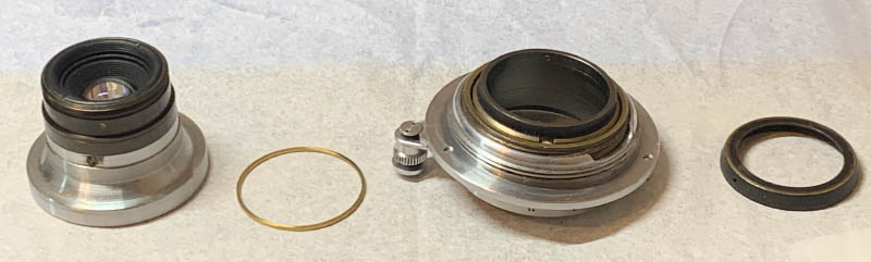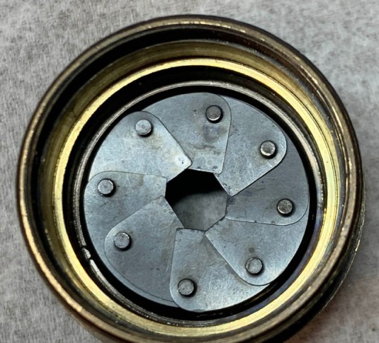 The iris mechanism can be dismantled by removing this circlip. Note that the diaphragm cup is concave, it should be facing this way, with the concave side covering the blades. It’s identical to the S-mount version.