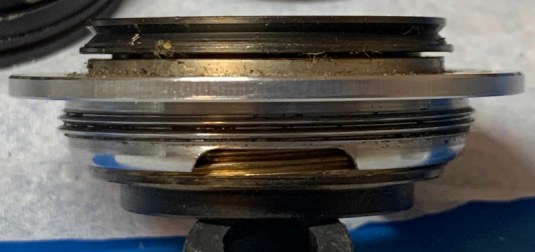 I cleaned all of the large parts with a strong toilet cleanser – the grainier, the better. I scrubbed everything using a brush then rinsed them all very well with hot water before making a final rinse with pure alcohol to remove any remaining residue. Special care must be used when cleaning the helicoids, the threads are fine in some places and they can be caked with gunk, using a wooden toothpick helps here for stubborn deposits. Dry them well before you continue. When lubricating, be sure not to apply too much, all you will need is a thin film of fresh grease. Mate the helicoids then exercise them by turning several times, this will ensure that the grease is evenly distributed. Wipe away any excess. If you have applied too much grease it will settle in the iris mechanism eventually, necessitating the need to open it again, just to give everything another overhaul.