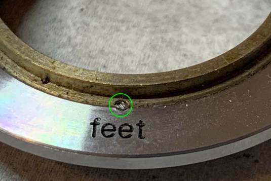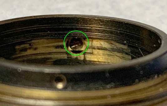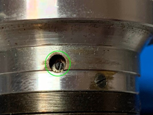 Turn the aperture ring until this hole is above the tiny screw. Extract it so you’re able to remove the inner cup, this screw also ensures that the aperture display/detent spring is aligned perfectly. Use a rubber cup to turn the inner cup of the aperture ring until it comes off.