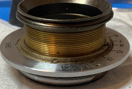 This is probably the most complicated part of the whole repair process because everything is small and it is not easy to take apart the optics without a special tool. One must be very careful when cleaning it, the glass is very thin in some areas and you could easily break it if you’re not careful. The aperture mechanism is tiny but it’s not difficult to put back if you have enough experience with these kinds of lenses. It’s better to leave it alone if the glass isn’t dirty or the iris isn’t oily. You must also be very careful when cleaning the bezel because it’s just brass that’s been painted. I’ve had the unfortunate incident of stripping the bezel, it was so clean that even the paint has disintegrated into nothing so I had to repaint everything myself.